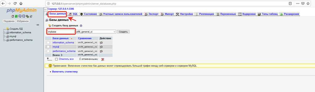 Откороется панель управления phpMyAdmin. Теперь вам будет предложено создать новую базу данных. Назовем ее например mybase. После того, как вы ввели имя, нажмите «Создать» и закройте окно.
