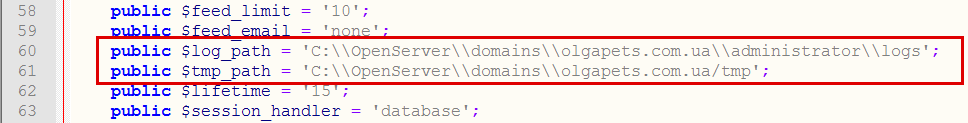 Также вам нужно заменить путь к временной папке и логам в параметрах public $tmp_path и public $log_path, в противном случае вы не сможете обновлять CMS и установленные расширения.