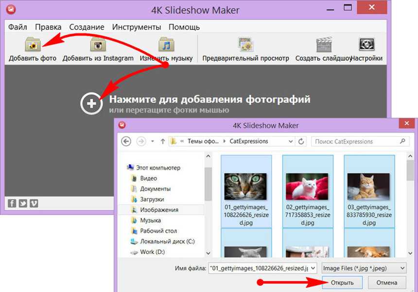 Для создания слайд-шоу добавляем фото. Их можно добавить с локального диска компьютера или подгрузить с Instagram. В первом случае жмём кнопку «Добавить фото» на панели инструментов программы или кнопку-плюсик по центру окна. Выбираем папку и добавляем нужные фото.