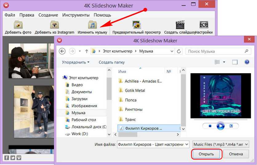 Теперь кнопкой «Изменить музыку» добавляем, собственно, аудиотрек.