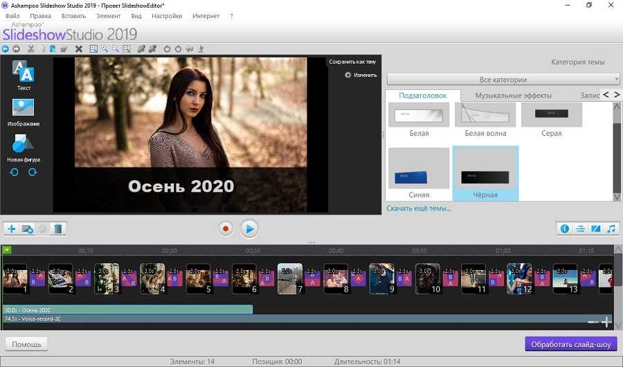 Эта программа работает на русском языке и позволяет создавать яркие видеоклипы с музыкой c нуля или по готовым шаблонам. В ФотоШОУ PRO вы сможете оживлять фотографии, добавлять переходы для стильной смены слайдов, накладывать анимированные эффекты, музыку или проводить озвучку голосом.