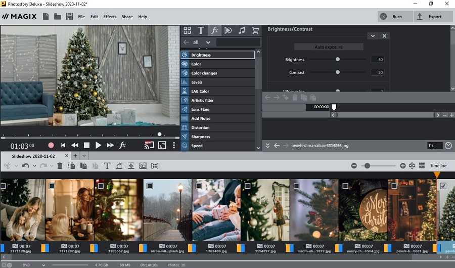 Для тех, кто хочет самостоятельно настроить параметры, присутствует редактор для слайдов, настройка плавной смены кадров, можно встраивать надписи и аудиотреки. Присутствуют профессиональные спецэффекты и инструменты вроде 3D-симуляции, дисторсии и панорамы. В целом MAGIX PhotoStory подойдет для любых задач, но работа в ней осложняется из-за отсутствия русского языка и непростого управления.