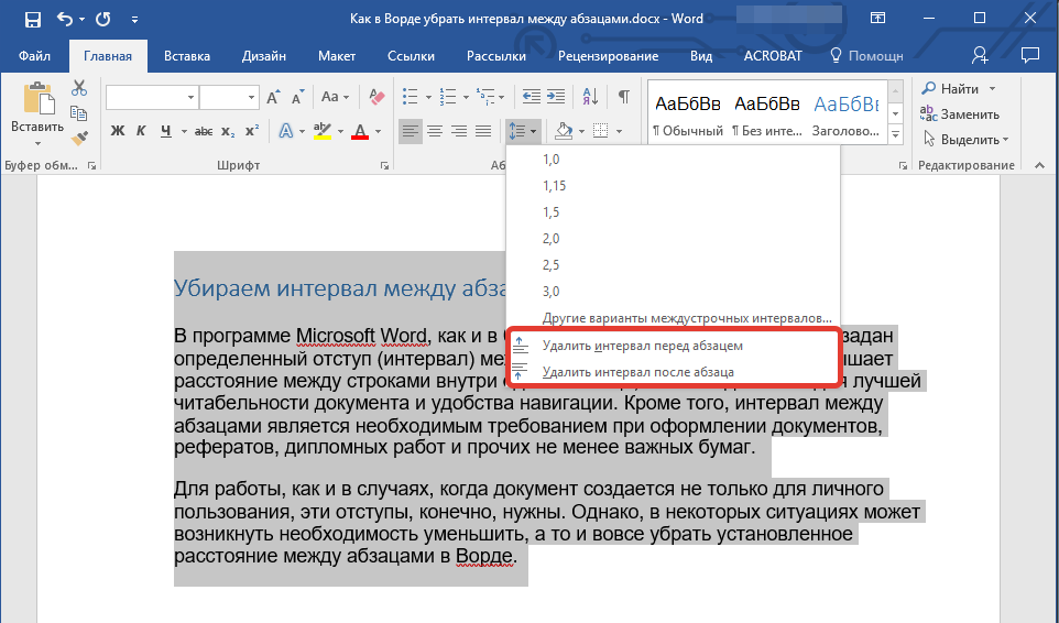 Если вы хотите удалить слишком большие пробелы между абзацами, то это также можно сделать в блоке «Абзац» в разделе «Интервал». Здесь есть возможность установить расстояние между строками внутри абзаца – междустрочный интервал, а также меду разными абзацами. При этом учтите, что, установив значения в полях «Перед» и «После», эти значения будут суммироваться на стыке абзацев. Поэтому лучше выбрать один вариант, но для всех типов абзацев в вашем документе.