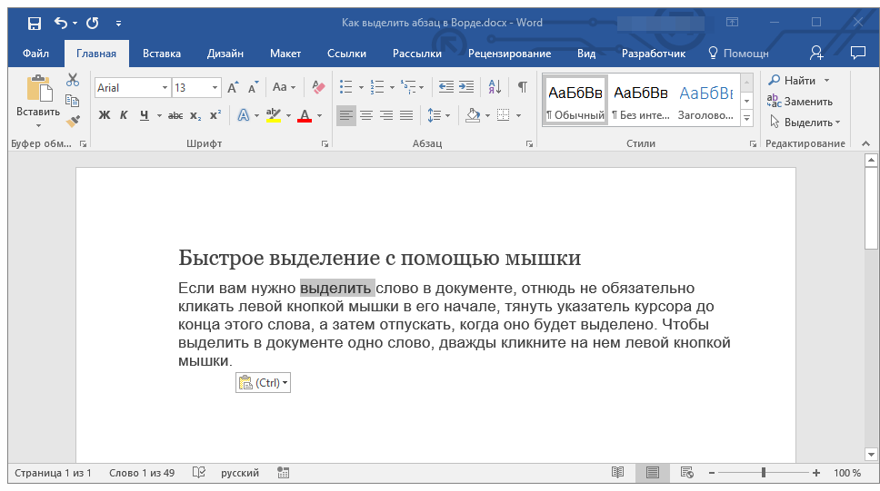 Не все знают, что выделять слова, отдельные строки и целые абзацы, что особенно интересует нас в рамках рассматриваемой темы, можно не «вождением» мышки от начала в конец, а кликами ее левой кнопки (ЛКМ). Так, выделить одно слово можно двойным нажатием ЛКМ на нем.
