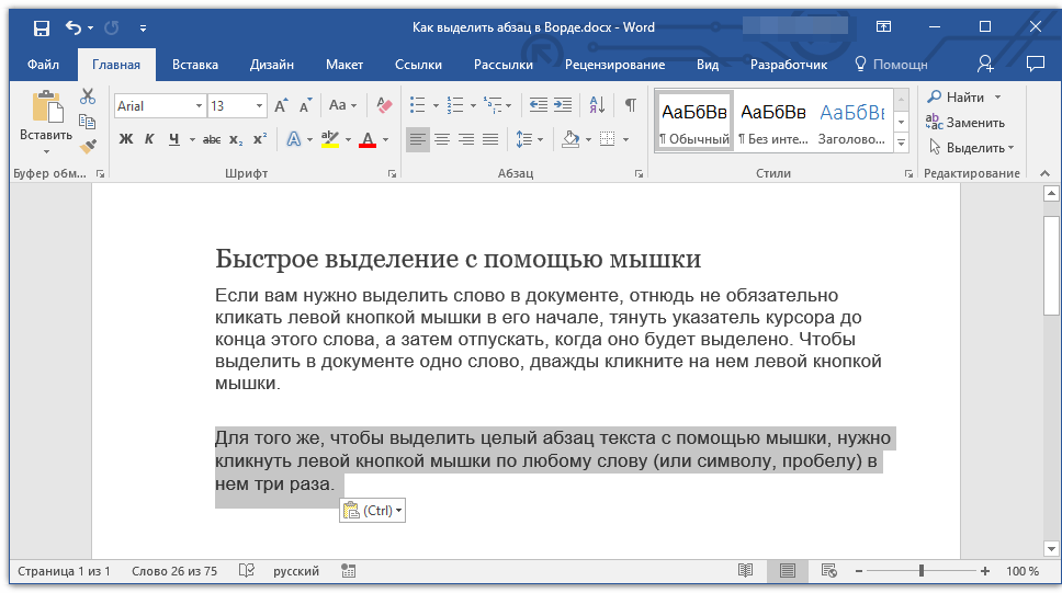 А вот для того, чтобы выделить абзац с текстом, необходимо трижды быстро кликнуть ЛКМ в любом его месте. К слову, это же сработает с предложением и/или заголовком, записанным в отдельной строке (то есть с отступами до и после).