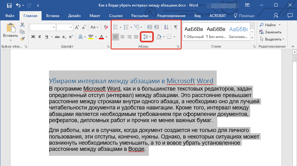 Метод, который мы рассмотрели выше, позволяет быстро переключаться между стандартными значениями интервалов между абзацами и их отсутствием (опять же, стандартным значением, установленным в Ворд по умолчанию). Если же вам нужно выполнить точную настройку этого расстояния, задать какое-то свое значение, чтобы оно, к примеру, было минимальным, но все же заметным, проделайте следующие действия: