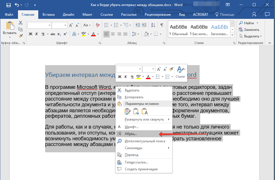 2. Кликните правой кнопкой мышки по тексту и выберите пункт “Абзац”.