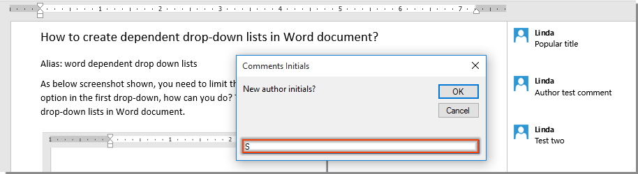 4. В следующем открытии Инициалы комментариев диалоговом окне введите нужные инициалы и нажмите кнопку OK кнопку.