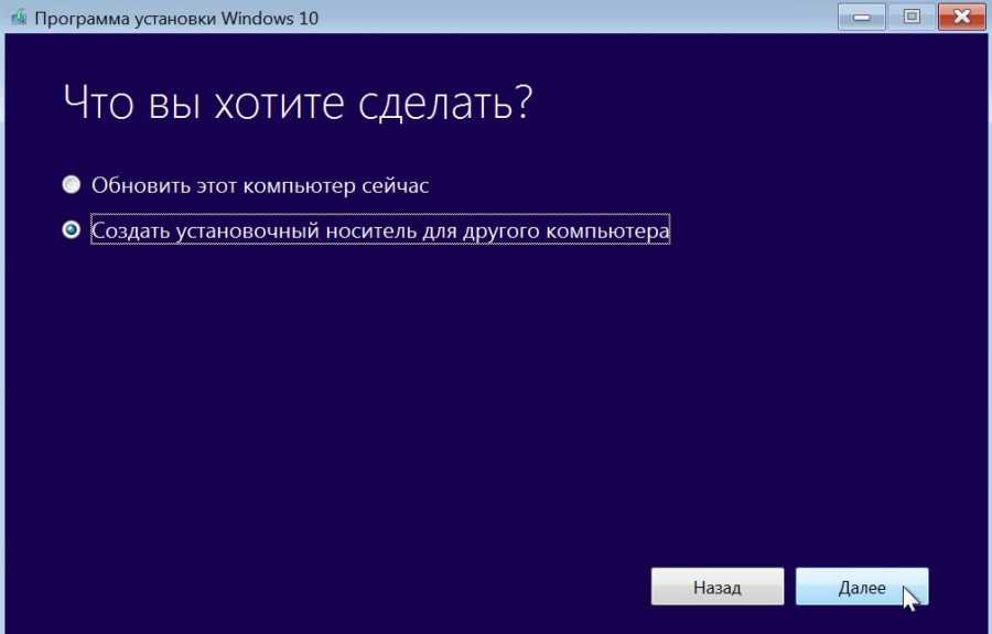 В следующем шаге укажите дальнейшее действие. Здесь можно выбрать функцию обновления системы, а также вариант загрузки установщика Windows 10. Отметьте второй вариант, то есть «Создать установочный носитель для другого компьютера».