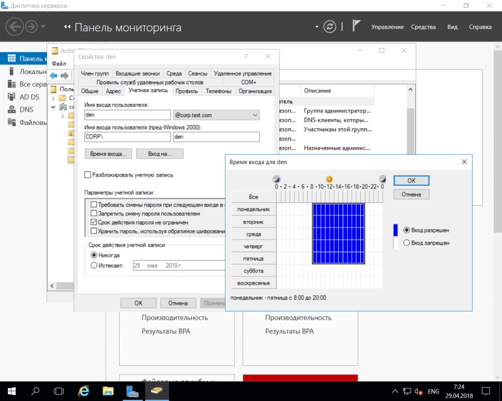 Рис. 7. Установка времени входа учетной записи в Windows Server