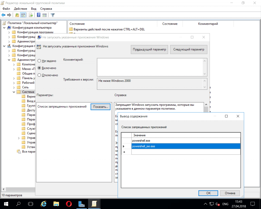 Отдельной групповой политики, запрещающей запуск PowerShell, нет, но есть групповая политика, запрещающая запуск определенных приложений. Она называется Не запускать указанные приложения Windows и находится все в том же разделе Система. Включите ее и запретите запуск powershell.exe and powershell_ise.exe (рис. 5).