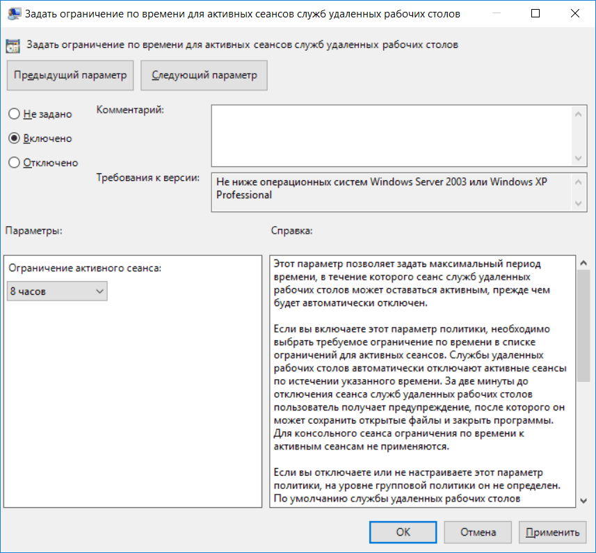 Групповая политика Конфигурация пользователя, Административные шаблоны, Компоненты Windows, Службы удаленных рабочих столов, Узел сеансов удаленных рабочих столов, Ограничение сеансов по времени, Задать ограничение по времени для активных сеансов служб удаленных рабочих столов позволяет задать максимальную продолжительность сеанса. Ее можно установить, например, в 8 часов.