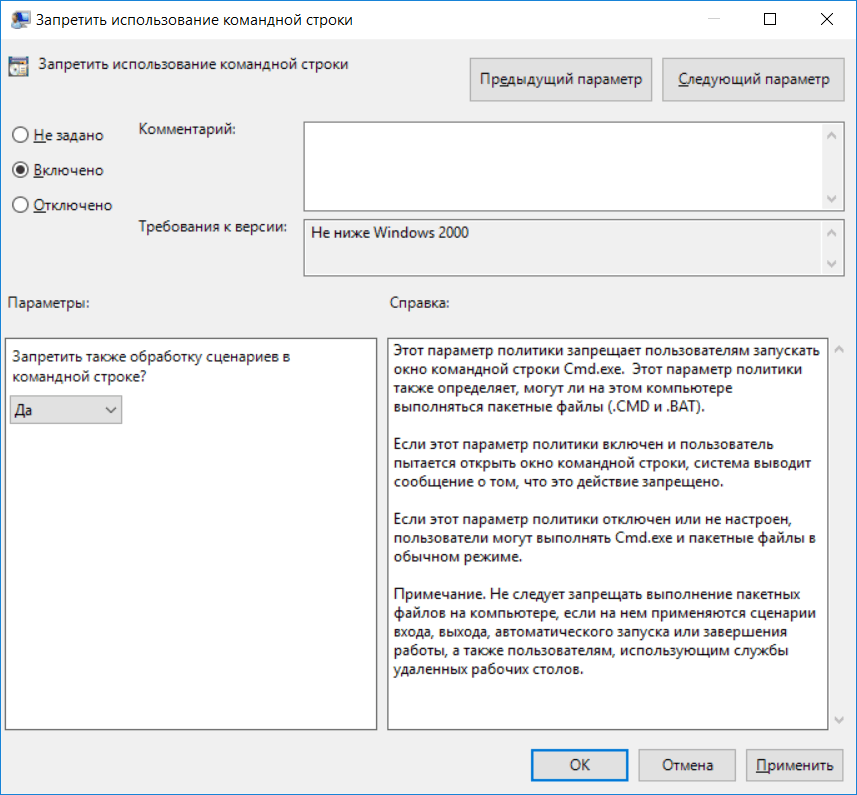 Рис. 4. Запрещаем использование командной строки в Windows Server
