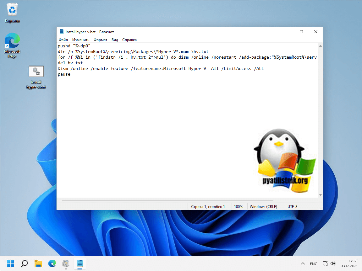 pushd «%~dp0″ dir /b %SystemRoot%\servicing\Packages\*Hyper-V*.mum >hv.txt for /f %%i in (‘findstr /i . hv.txt 2^>nul’) do dism /online /norestart /add-package:»%SystemRoot%\servicing\Packages\%%i» del hv.txt Dism /online /enable-feature /featurename:Microsoft-Hyper-V -All /LimitAccess /ALL pause