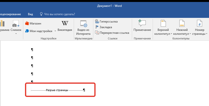 - Переход в раздел «Разрывы», который откроет новое окно.