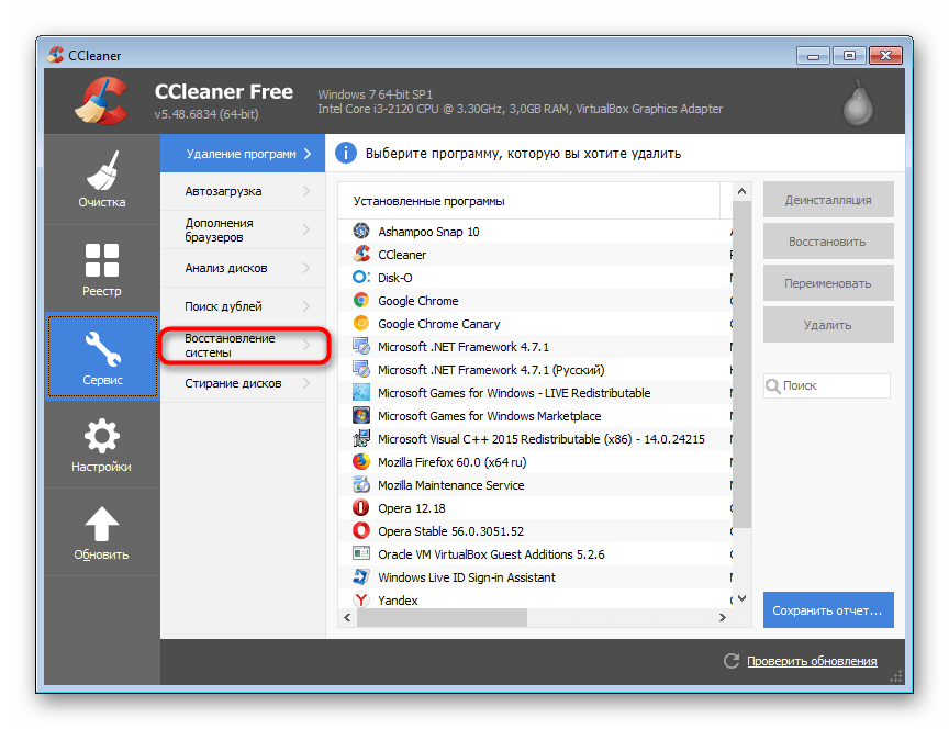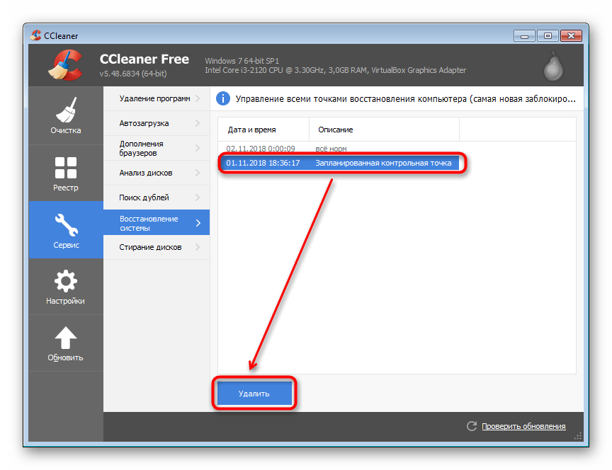 Как уже было сказано ранее, функциональность многих утилит для очистки Windows от мусора позволяет управлять и точками восстановления. Поскольку в своем большинстве на компьютерах установлен CCleaner, процедуру мы будем рассматривать на этом примере, а если вы являетесь владельцем аналогичного ПО, поищите соответствующую возможность среди всех доступных функций и произведите удаление по аналогии с описанными ниже рекомендациями.