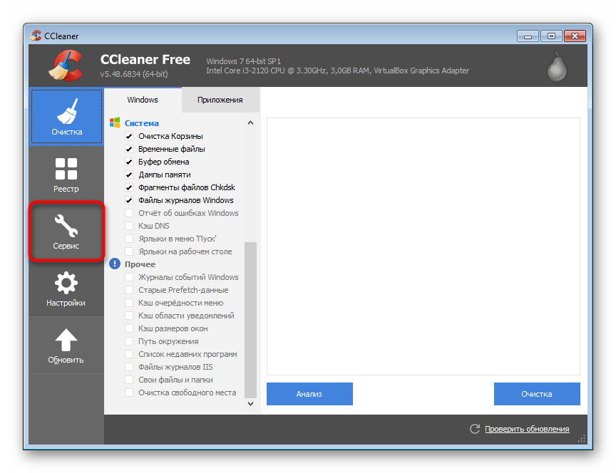- Запустите утилиту и переключитесь на вкладку «Сервис».