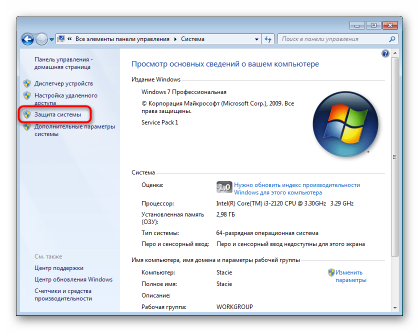 Откроется новое окно, где, используя левую панель, перейдите в «Защита системы».