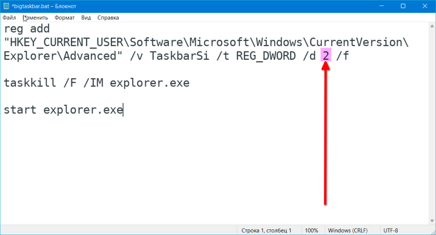 Чтобы иметь возможность вернуть исходный размер Панели задач, создайте третий «батник» со значением 1 — mediumtaskbar.bat