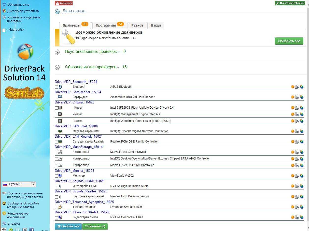 - Автоматический поиск на компьютере/ноутбуке отсутствующих или устаревших драйверов.