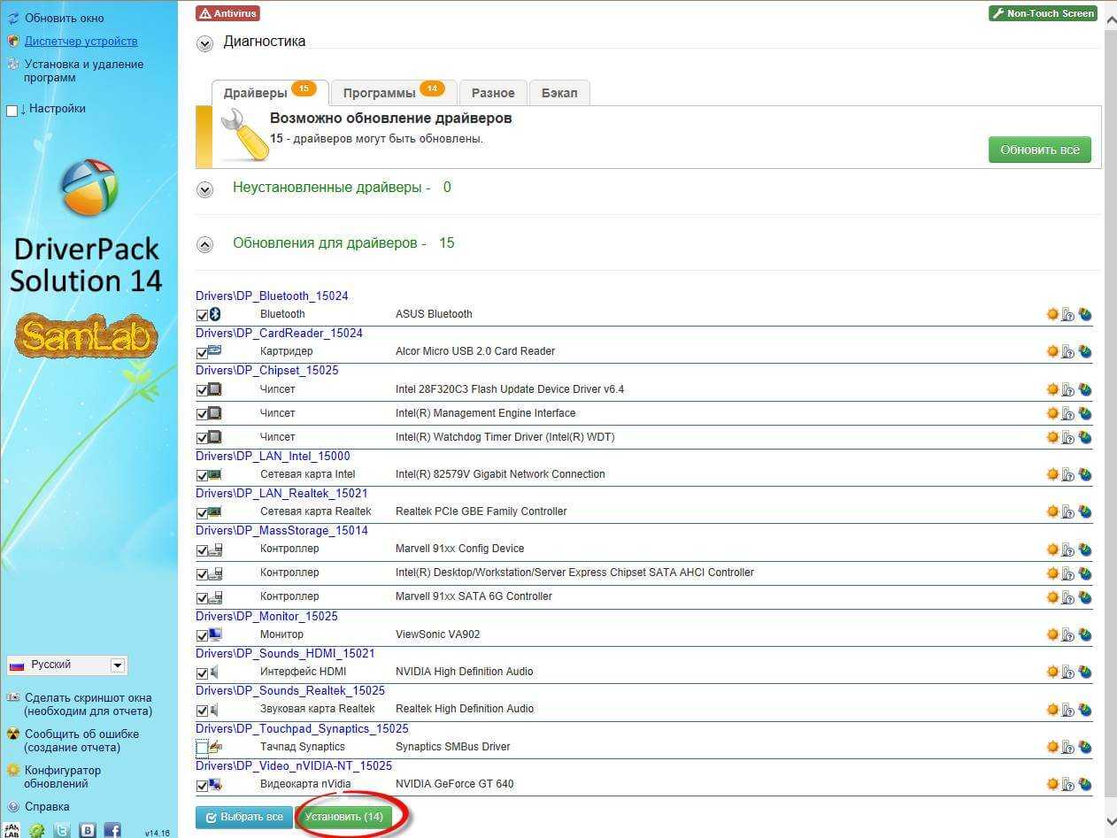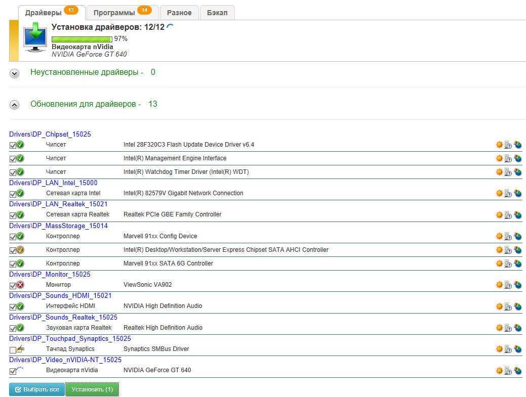 Повторяю, этого можно не делать и полностью довериться программе! Итак, оставляем галочки на отобранных драйверах и нажимаем «Установить». Напротив каждого устройства должно появиться слово «Установлено». Если же у вас одни ошибки, то вероятно программе мешает антивирус. У меня стоит ESET NOD32 и ни один драйвер не устанавливался, хотя и никаких предупреждений об ошибках я не получил.