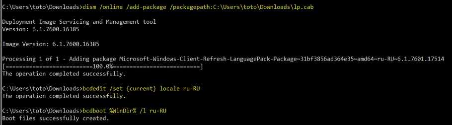 - «DISM /Online /Add-Package /PackagePath:<path_to_lp_dir>», где «<path_to_lp_dir>» — расположение конкретного скачанного lp.cab;