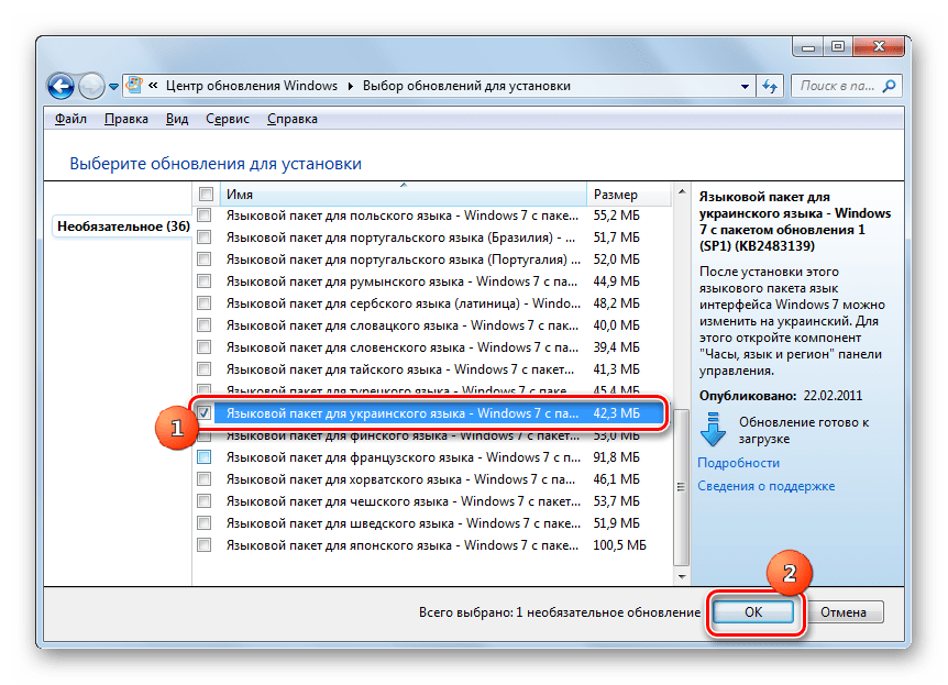 Соответственно в появившемся отчете нам следует нажать на ссылку с необязательными обновлениями, после чего откроется список доступных к загрузке и установке языков системы, отметив желаемы языковые пакеты для Windows 7 нажимаем «Ок» и запускаем установку.