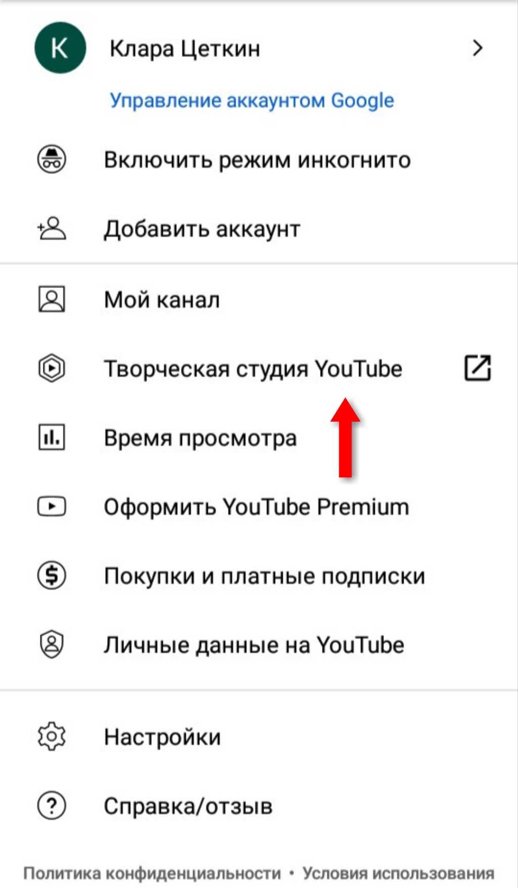 Ещё один способ проверки с помощью мобильного телефона — появление строки «Творческая студия YouTube» в меню, появляющиеся после клика на аватарку в мобильном приложении.