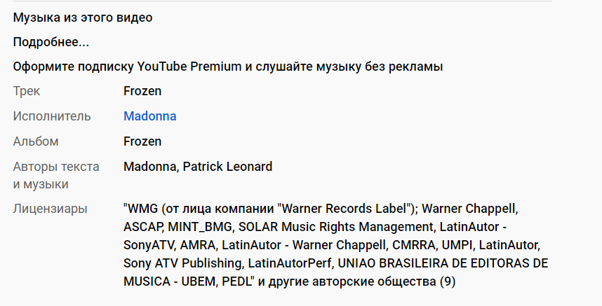 Проверить ролик на авторские права можно в самом YouTube. Для этого выберите нужный трек или тему видео и введите в поиск. Откройте подходящий результат. А потом раскройте описание видео. Если есть лицензия, это будет указано. Имена правообладателей – тоже. Чаще всего это блок «Музыка из видео», но бывают и исключения – например, права на фрагмент фильма.