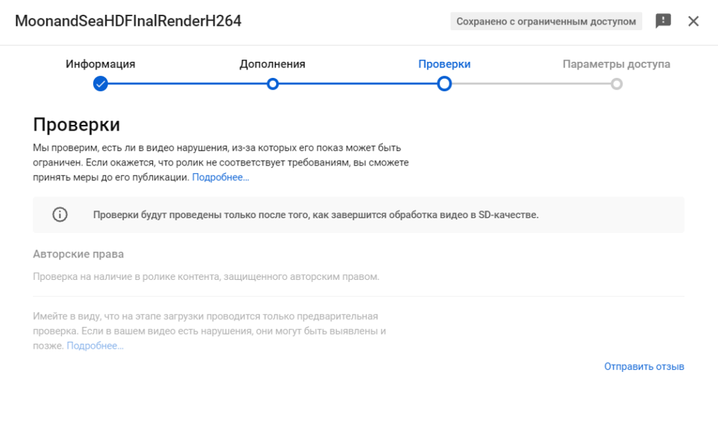 Чтоб проверить видео на авторские права, загрузите его, но не публикуйте. Прямо во время загрузки алгоритм проверит его. Проверка занимает около пяти минут. Если ролик нарушает авторское право, появится предупреждение — красный или жёлтый значок. Если всё в порядке, значок будет зелёным.