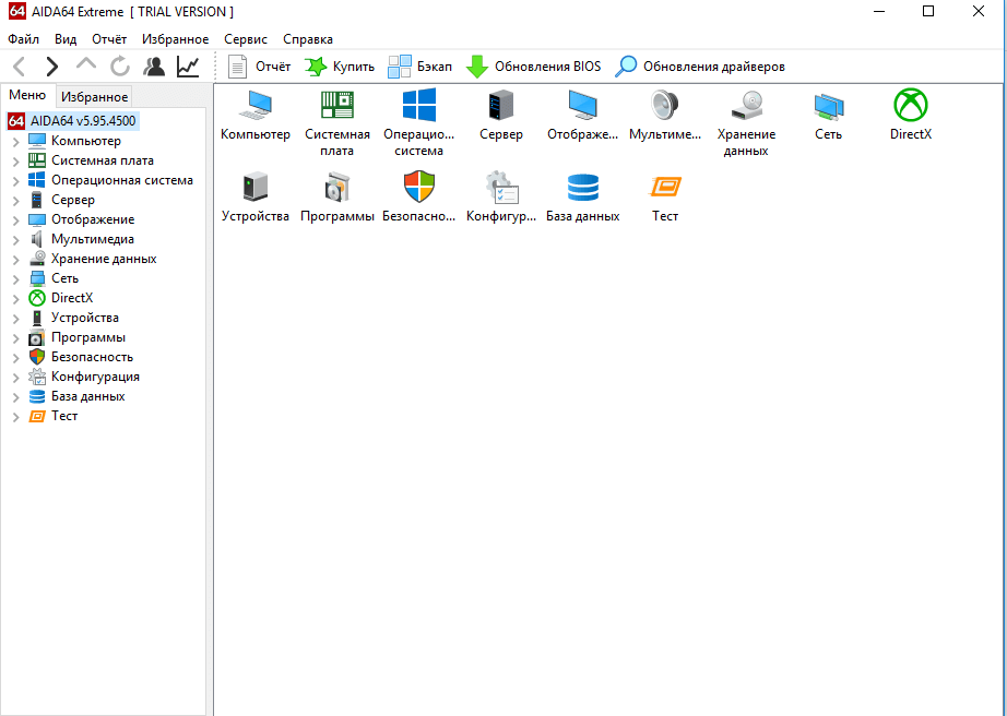 В главном окне AIDA64, в левой колонке расположены вкладки «Меню» и «Избранное». Во вкладке «Меню» находятся разделы: «Компьютер», «Системная плата», «Операционная система», «Сервер», «Отображение», «Мультимедиа», «Хранение данных», «Сеть», «DirectX», «Устройства», «Программы», «Безопасность», «Конфигурация», «База данных», «Тест». В свою очередь, в этих разделах есть подразделы для более конкретного выбора компонента системы.