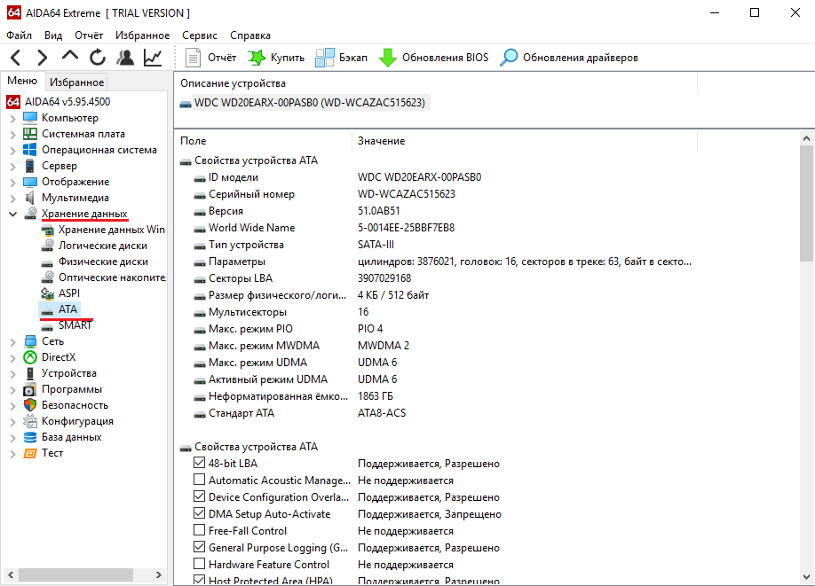 Перейти во вкладку хранения данных, а там выбрать вкладку ATA. Именно данная вкладка и будут отвечать за всю информацию о вашем жестком диске, его значениях, свойствах, типе устройства и многое другое.