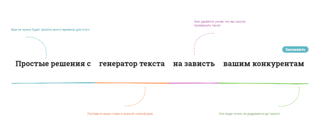 Какие-либо условия касательно содержания задавать вы не сможете. Просто жмете на кнопку и получаете много слов, сгруппированных в предложения.