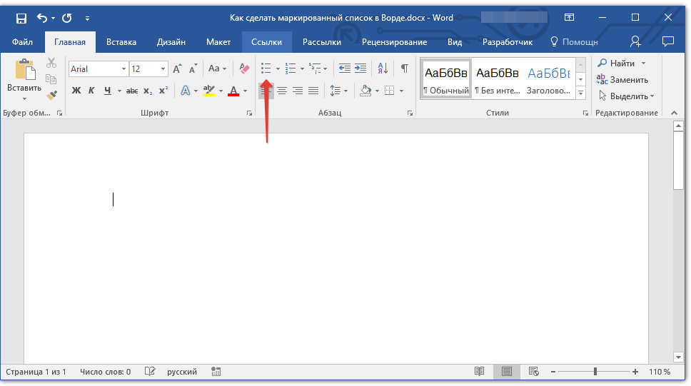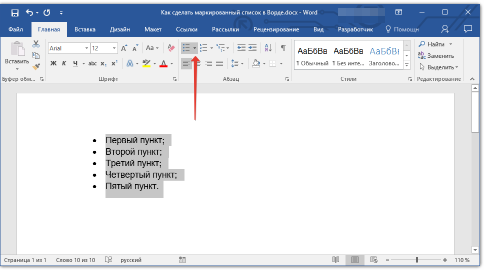 5. На панели быстрого доступа во вкладке “Главная” нажмите кнопку “Маркированный список” (группа “Абзац”).