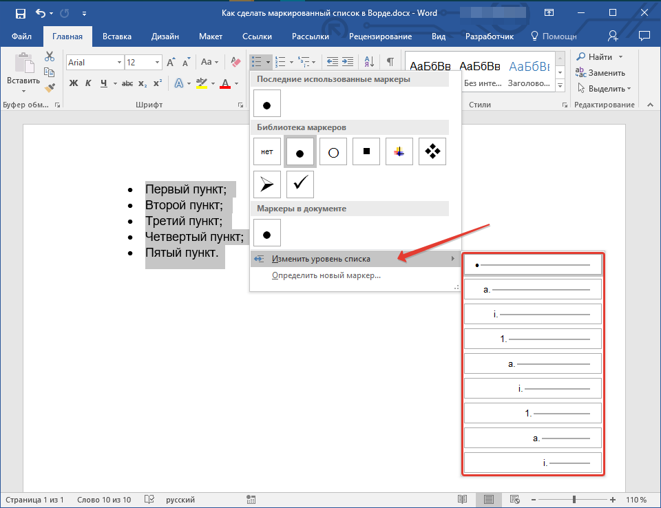 4. Выберите уровень, который вы хотите задать для созданного вами маркированного списка.