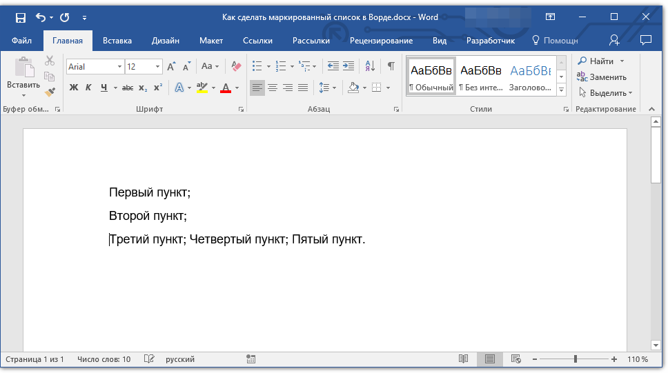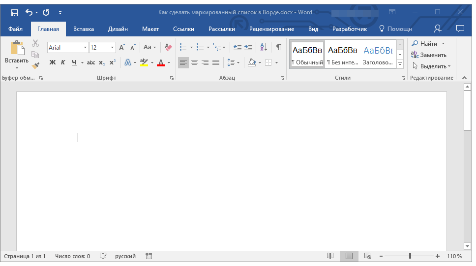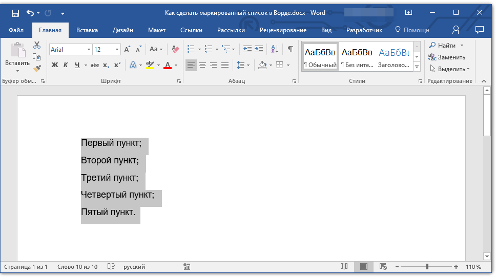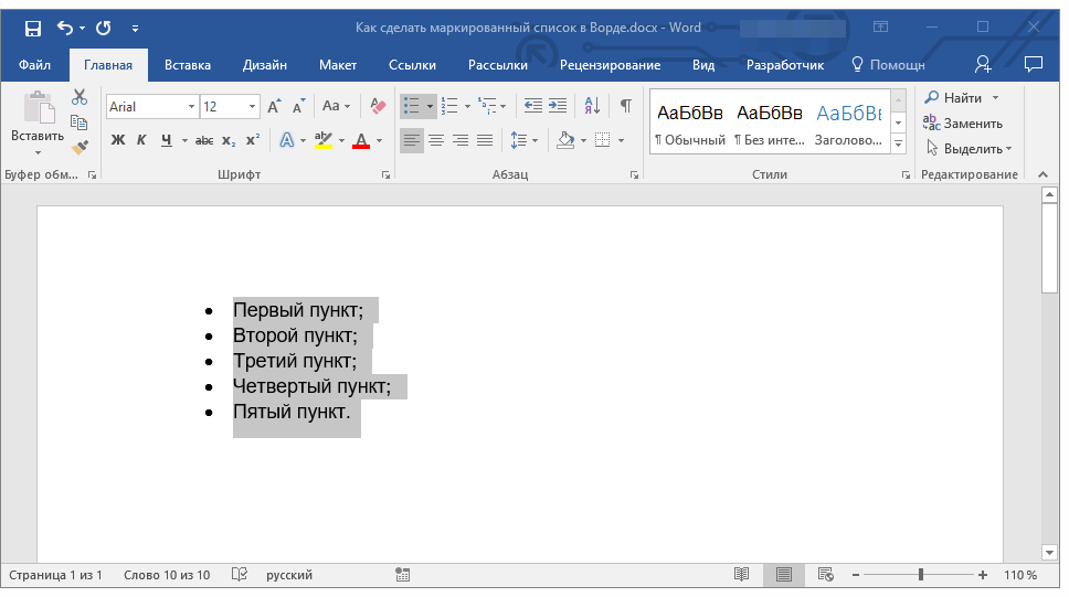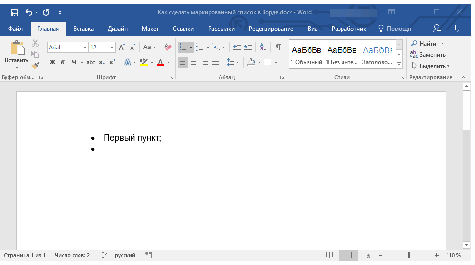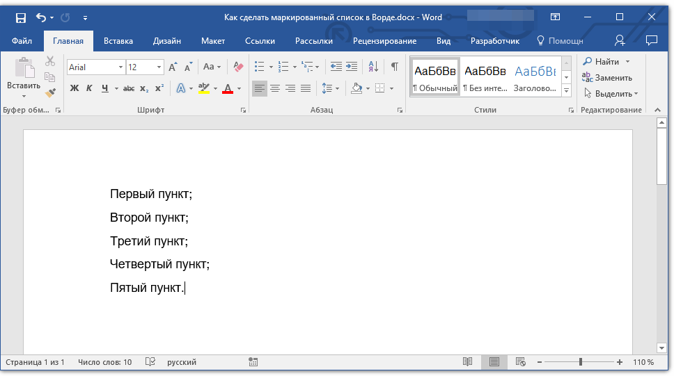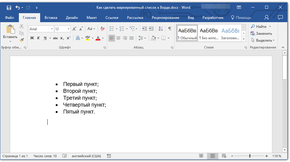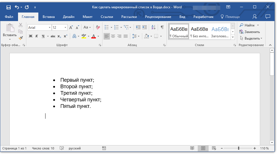 Если вам необходимо создать нумерованный список, а не маркированный, нажмите кнопку “Нумерованный список”, расположенную в группе “Абзац” во вкладке “Главная”.