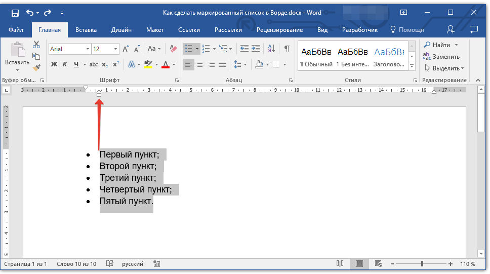 Примечание: Красной стрелкой на скриншоте показана начальная позиция табуляции для маркированного списка.