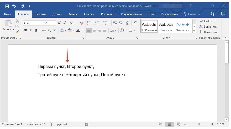 1. Установите курсор в конце слова, фразы или предложения, которое должно быть первым пунктом в будущем списке.