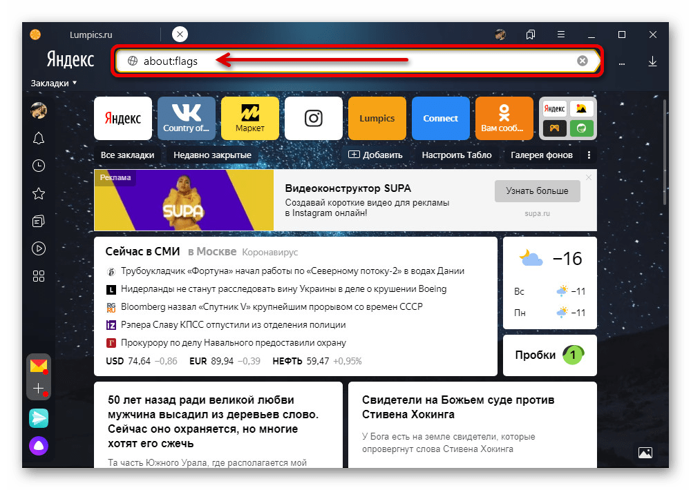 В актуальной версии Яндекс.Браузера присутствует довольно большое количество скрытых настроек, доступных в отдельном разделе и, зачастую, позволяющих выполнять задачи, недоступные обычными средствами. Перейти на нужную страницу можно одним единственным способом, аналогичным для большинства веб-обозревателей на том же движке.