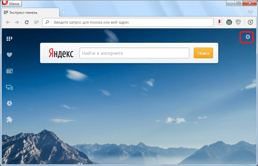 После запуска браузера, открывалась начальная страница, на которой, как видим, Экспресс-панель отсутствует. Кликаем на иконку в виде шестеренки в верхнем правом углу экрана, и переходим в раздел управления начальной страницы, чтобы настроить Экспресс-панель в Опере.