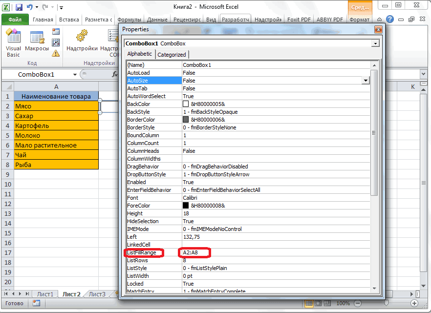 - ListRows — количество данных в выпадающем списке. Элемент ActiveX отличается от первого способа тем, что можно указать большое количество данных.