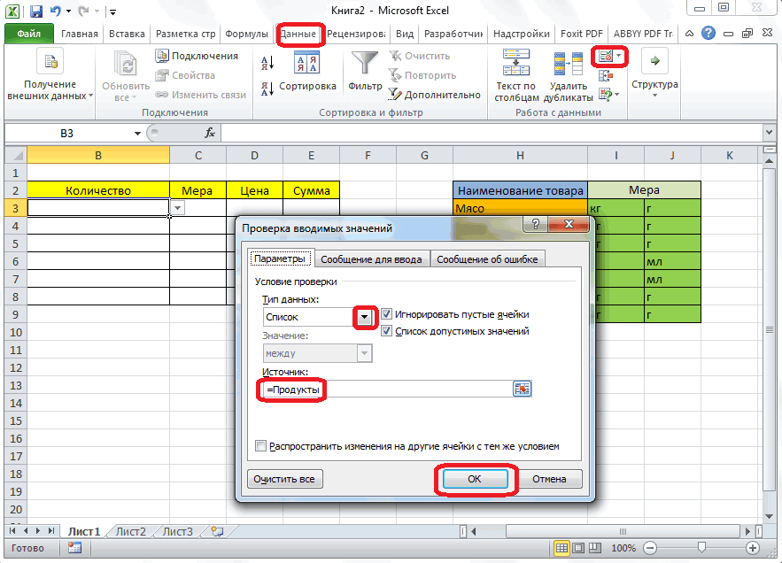 - В появившемся окне надо заполнить информацию на вкладке «Параметры»: в пункте «Тип данных» указать «Список», а в пункте «Источник» — название ячеек (=товары).