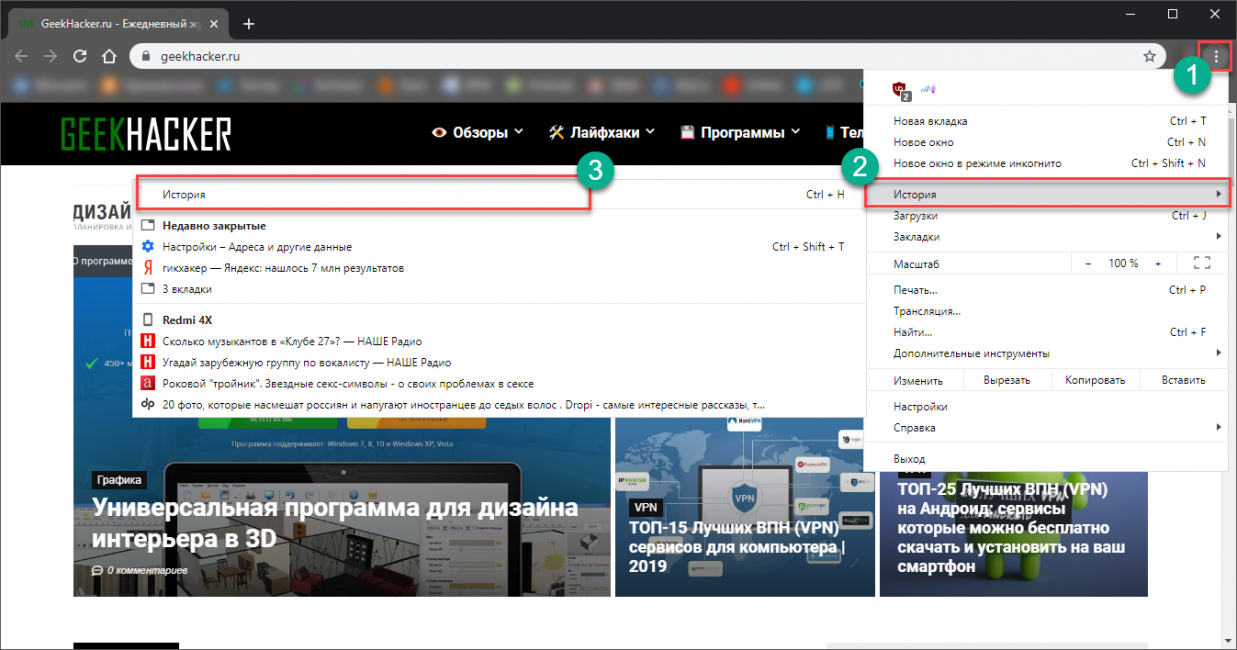 Для начала нам придется удалить все данные. Открываем Хром , кликаем по кнопке с тремя точками, выбираем История и затем снова кликаем История в следующем меню. Добраться до нужного окна настроек можно и при помощи сочетания Ctrl+H