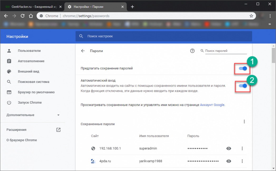 Передвигаем переключатели напротив пунктов Предлагать запоминание паролей и Автоматический вход в положение Выкл