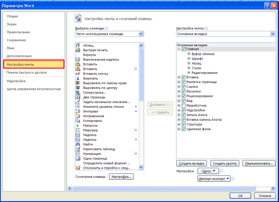 - Дальше ищите «Настройка ленты», отмечайте галочками нужные значки.