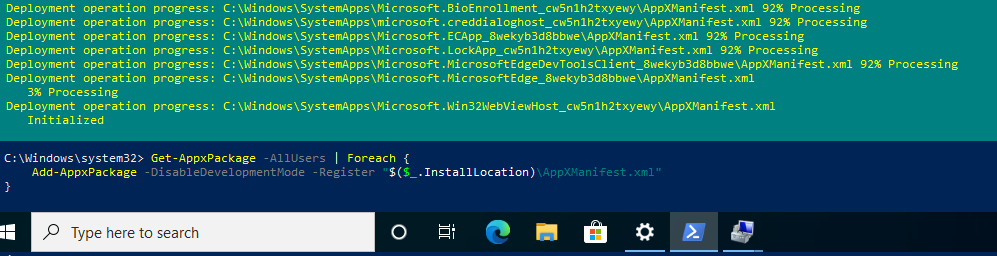 Get-AppxPackage -AllUsers| Foreach {Add-AppxPackage -DisableDevelopmentMode -Register "$($_.InstallLocation)\AppXManifest.xml"}