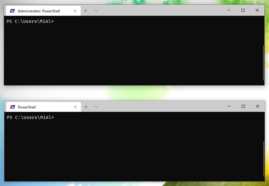 Всё становится сложнее, если PowerShell используется через Windows Terminal. Посмотрите на этот скриншот, один из этих терминалов открыт от имени администратора, а второй от имени обычного пользователя — они ничем не различаются.