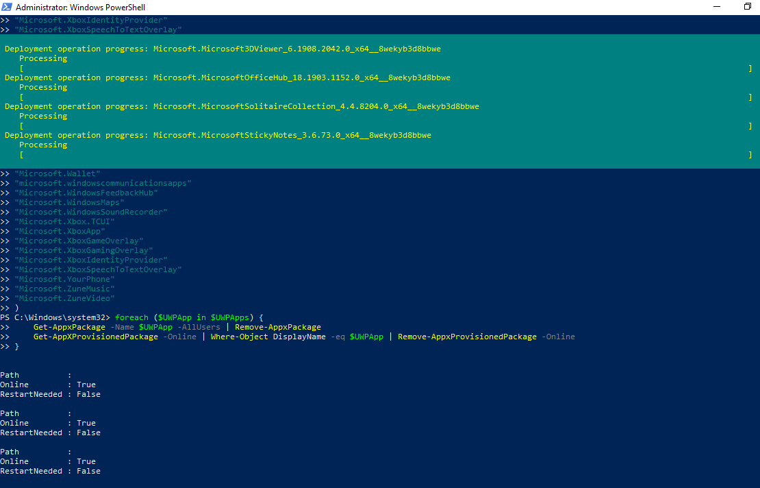 foreach ($UWPApp in $UWPApps) Get-AppxPackage -Name $UWPApp -AllUsers | Remove-AppxPackageGet-AppXProvisionedPackage -Online | Where-Object DisplayName -eq $UWPApp | Remove-AppxProvisionedPackage -Online>