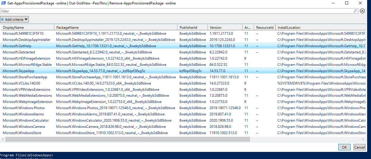 Данный скрипт выведет графическую таблицу со списком provisioned приложений в образе Windows 10. Вам достаточно выделить приложения, которые нужно удалить (несколько строк можно выбрать, зажав ctrl) и нажать Ok.