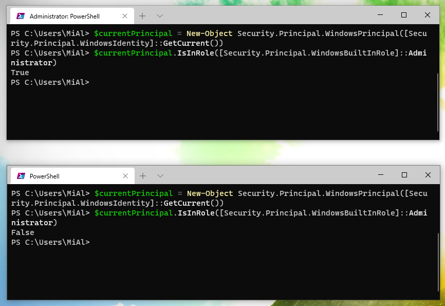 $currentPrincipal = New-Object Security.Principal.WindowsPrincipal(::GetCurrent()) $currentPrincipal.IsInRole(::Administrator)